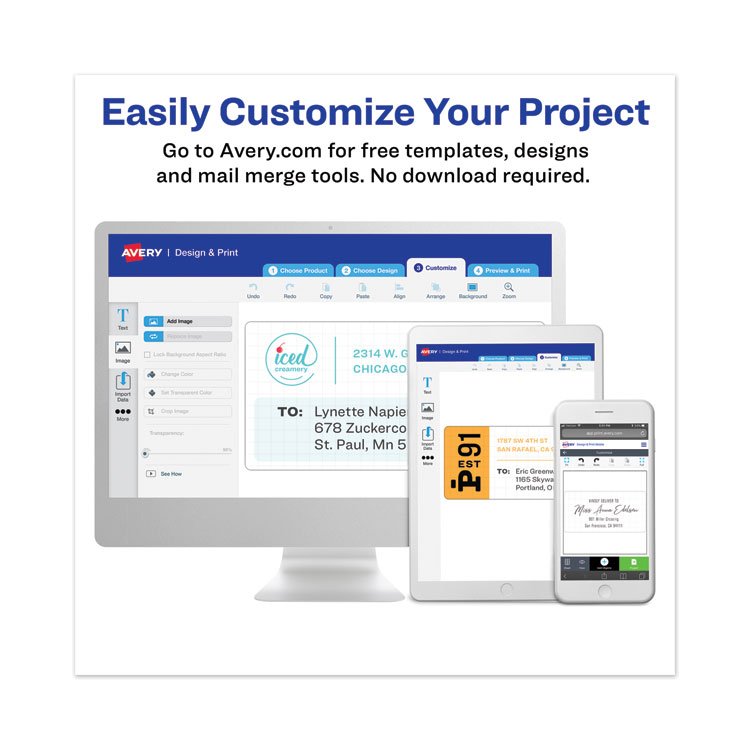 Avery Easy Peel White Address Labels w/ Sure Feed Technology (AVE5961) make labeling quick and easy. They're perfect for mailing, product branding, and organizing items like bottles, jars, food containers, and party favors. The Sure Feed technology ensures smooth printing with no misalignments or jams. The Easy Peel feature lets you bend the sheet, peel off the label, and apply it effortlessly. You can also customize your labels using free templates from Avery's Design & Print platform.