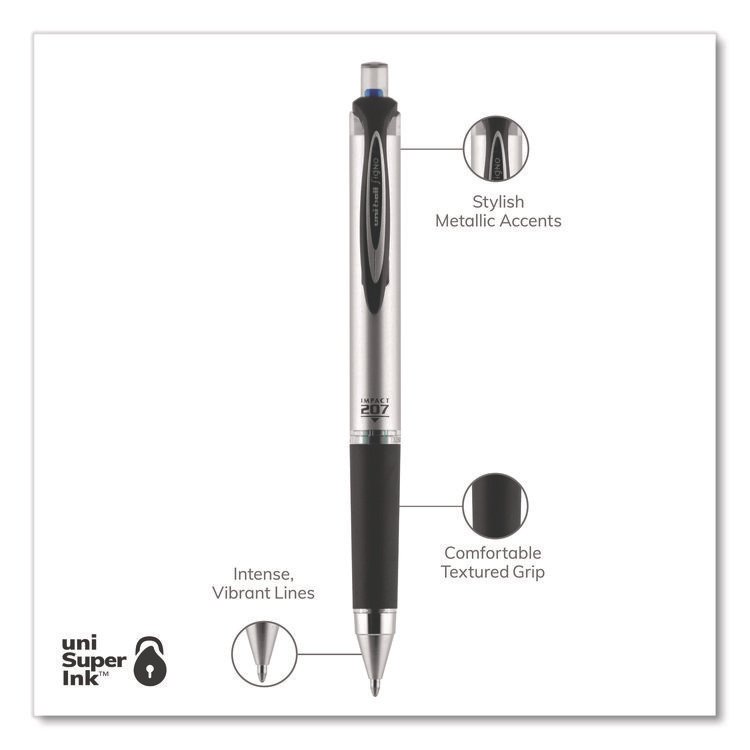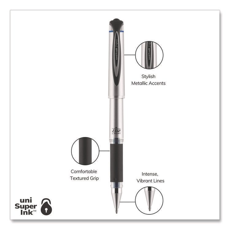 uniball 207 Impact Gel Pen, Stick, Bold 1 mm, Blue Ink, Silver/Black/Blue Barrel (UBC65801)