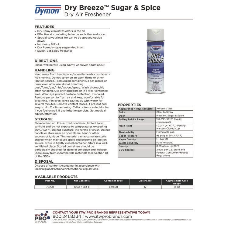 Dymon Dry Breeze Aerosol Air Freshener, Sugar and Spice, 10 oz Aerosol Spray, 12/Carton (ITW70220)