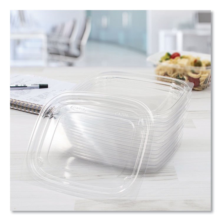 - Crystal clear lids make it easy to display the product in the container, making them an excellent choice for deli displays. A water-tight seal ensures easy food transportation without risk of leakage. Lids are easy to snap on and snap off. Designed to work with ClearPac food containers. One lid fits a variety of containers, helping to conserve storage space and speed on-the-go food services.